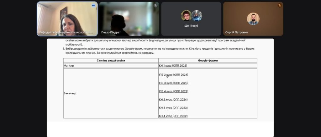 На кафедрі відбулася презентація вибіркових освітніх компонентів для здобувачів освіти спеціальностей Інженерія програмного забезпечення (ІПЗ) та Комп’ютерні науки (КН). Під час зустрічі студенти ознайомилися з переліком дисциплін, їх змістом, практичною спрямованістю та можливостями формування індивідуальної освітньої траєкторії.