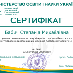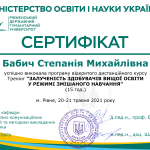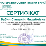 Луцький національний технічний університет. «Сучасні методи викладання технічних дисциплін у закладах вищої освіти». Свідоцтво СП 05477296/0002117-21 від 02.06.2021 р . (180 годин)